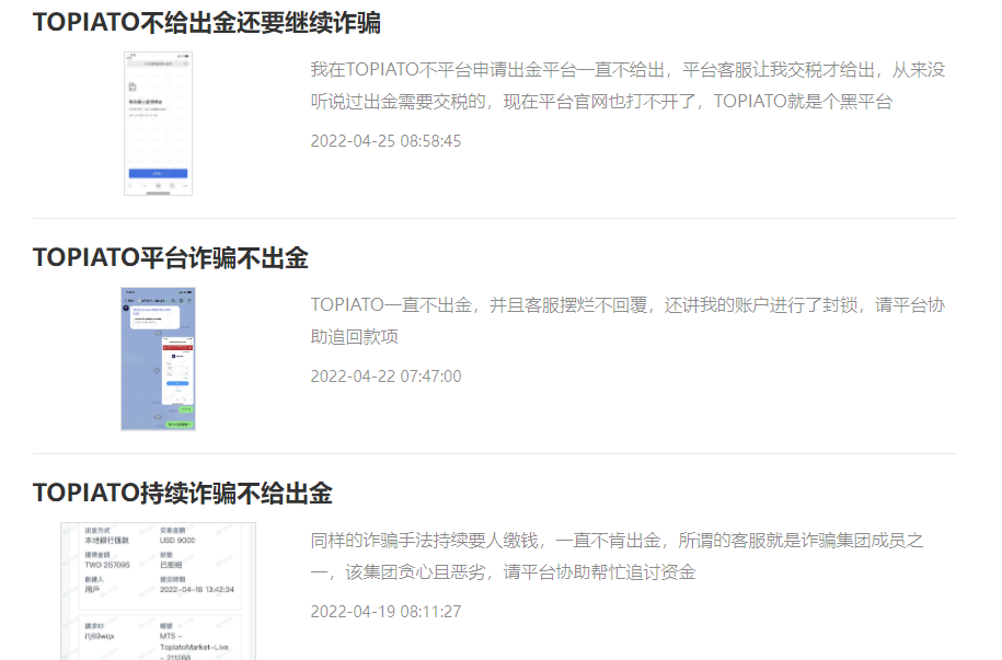 还有一位汇友遇到的情况也和上面两位相似,先是申请出金一直被拒绝,后来被要求先交税才能提现,最后TOPIATO网址直接无法打开了。