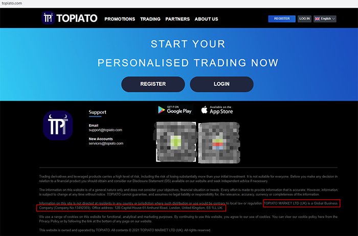 TOPIATO在官网底部以及“关于我们”的自我介绍中展示的是:提供外汇、股指、商品、贵金属、加密货币等交易服务,公司名称TOPIATO MARKET LTD (UK),注册于英国,注册号13492369,受美国NFA 0538567监管。
