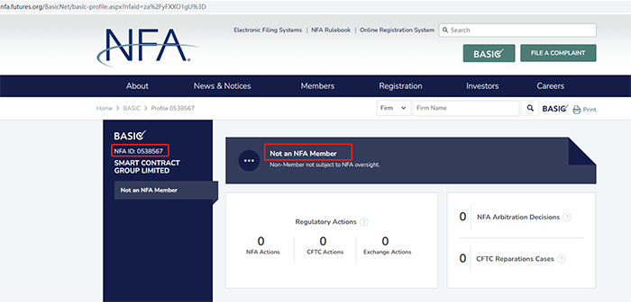 再来看看其所宣称的美国NFA监管。在美国NFA官网输入证号0538567,查到的公司名称SMART CONTRACT GROUP LIMITED,和平台名称不符。而且即便是该公司,也仅仅是普通注册,不是NFA会员,并不受美国NFA监管。