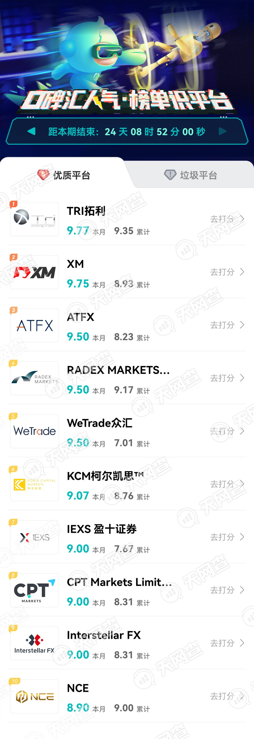 总体来看,优质榜TOP 10中,既有老牌交易商,也有比较新的平台,比如RADEX MARKETS 瑞德克斯。接下来,我们看看垃圾平台榜。