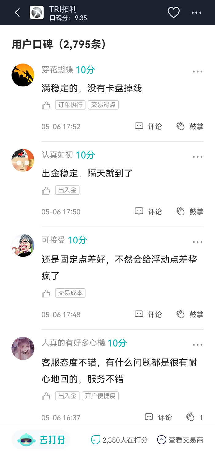 在天网查TRI拓利的口碑评论中,类似“原油固定点差0.3,没手续费”的评价比较多,“固定点差”是许多平台用户给与高分的一个点。当然,客服态度、出金速度表现也都不错。