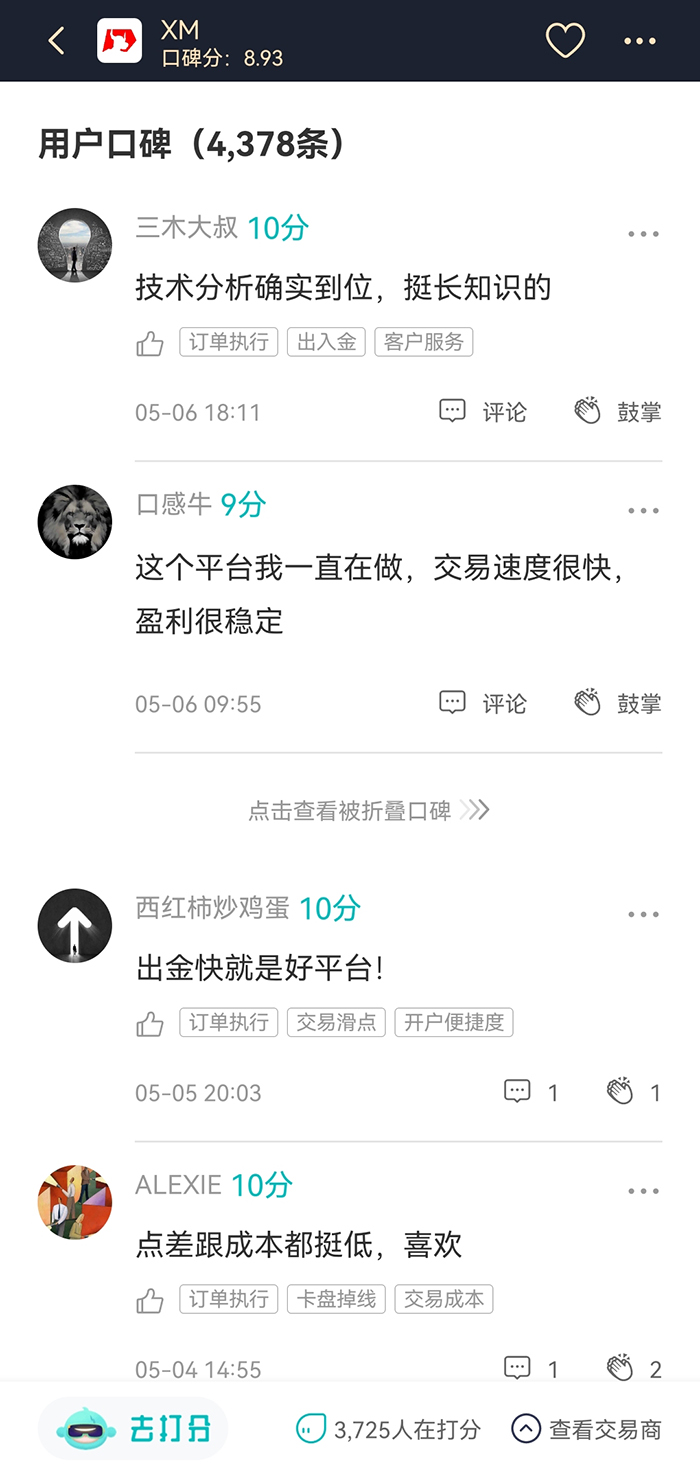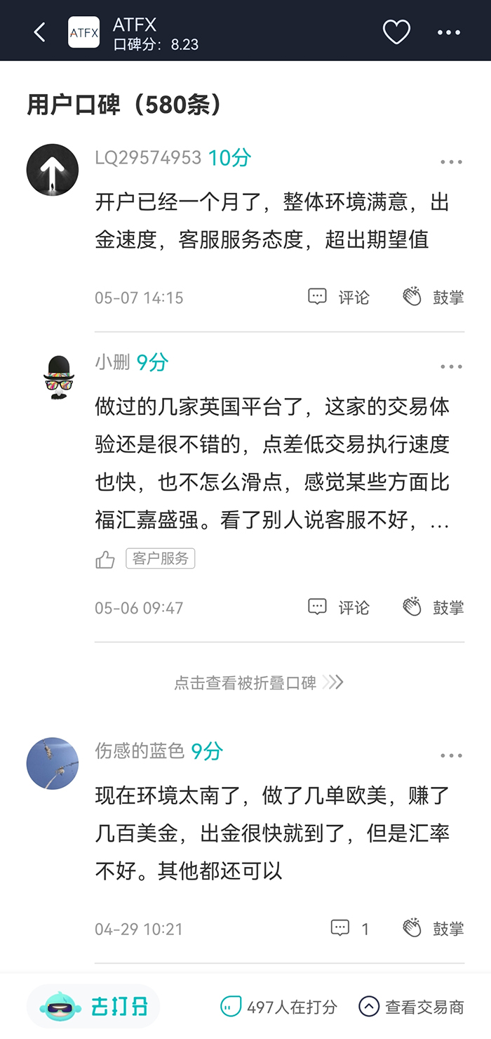 在ATFX的评论区,用户给出的分都是9分、10分,其中,交易执行速度快、出金到账快都让用户很满意。另外,还有用户推荐该平台的指数交易优势。