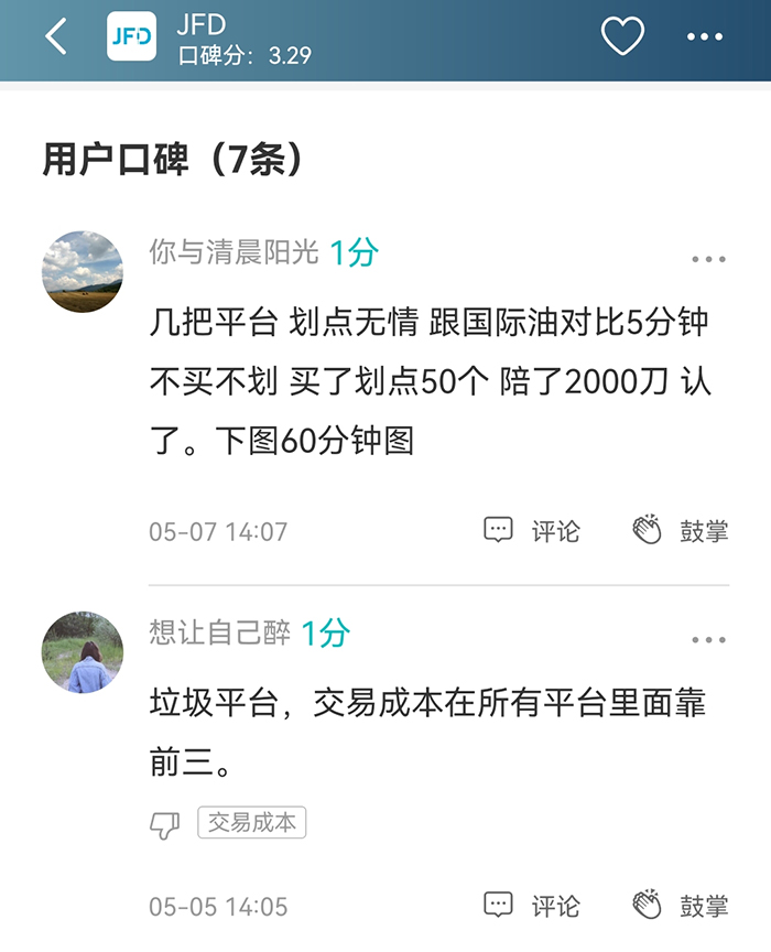 在JFD的口碑评论区,有用户评论其“滑点无情”,有用户称其“交易成本太高了,受不了,受不了”。