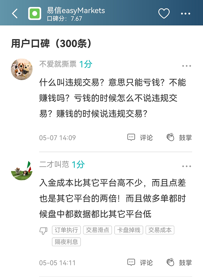 口碑评论区显示的新口碑不少打出了最低分1分,有用户被平台莫名判为“违规交易”,有用户吐槽其入金成本比其他平台高出一截,点差是其他平台的两倍。一位用了三年的用户都表示要换平台了。