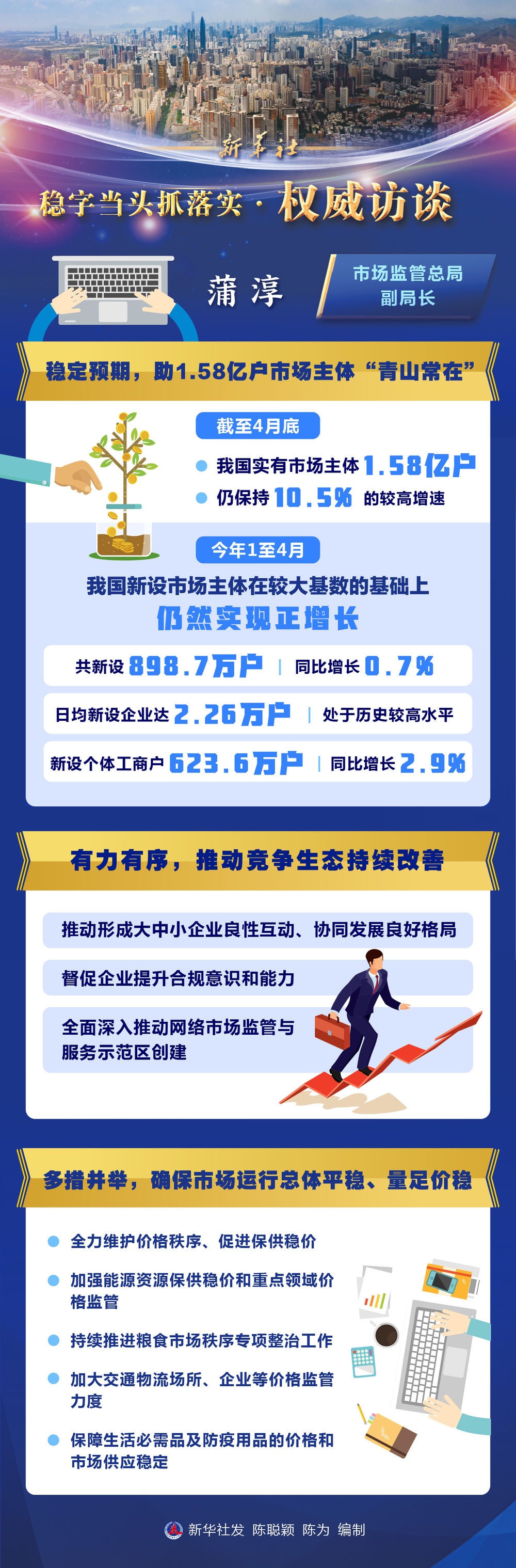 今年以来,国内疫情多点散发,受疫情冲击的部分中小微企业和个体工商户遇到新情况、新困难。如何稳住市场主体、进一步营造吸引市场主体投资发展的“沃土”?如何维护市场秩序,保障人民群众正常生产生活?市场监管总局副局长蒲淳接受了新华社记者采访。