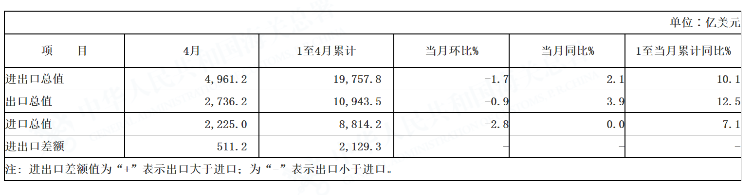 财联社5月9日讯(记者 张晓翀)海关周一公布数据显示,疫情影响下,4月进出口数据全面转入低位。当月我国出口显著下滑,进口近持平,贸易顺差走阔。数据显示,4月我国进出口总值4,961.2亿美元,增长2.1%,贸易顺差511.2亿美元,出口2,736.2亿美元,同比增长3.9%,进口2,225亿美元,同比持平。