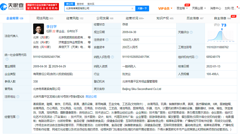 公开资料显示,北京寺库商贸有限公司成立于2009年4月,法定代表人及疑似实际控制人为李日学,该公司为“奢侈品电商第一股”寺库的运营主体。