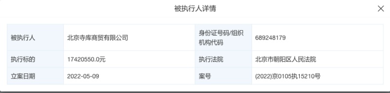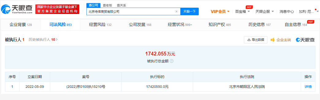 金融虎讯 5月10日消息,据天眼查App显示,5月9日,北京寺库商贸有限公司新增被执行人信息,执行标的1742万余元,执行法院为北京市朝阳区人民法院。该公司成立于2009年4月,法定代表人李日学,注册资本1000万人民币,由李日学、黄朝晖共同持股。