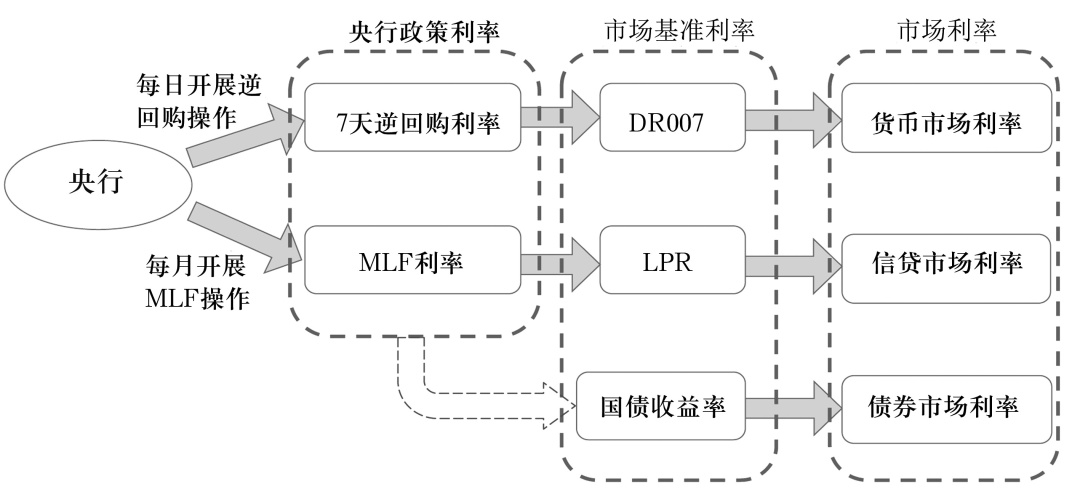 目前我国市场化的利率形成和传导机制,主要是通过货币政策工具调节银行体系流动性,释放政策利率调控信号,在利率走廊的辅助下,引导市场基准利率以政策利率为中枢运行,并通过银行体系传导至贷款利率,形成市场化的利率形成和传导机制,调节资金供求和资源配置,实现货币政策目标(易纲,2021)。其具体运行示意图如下: