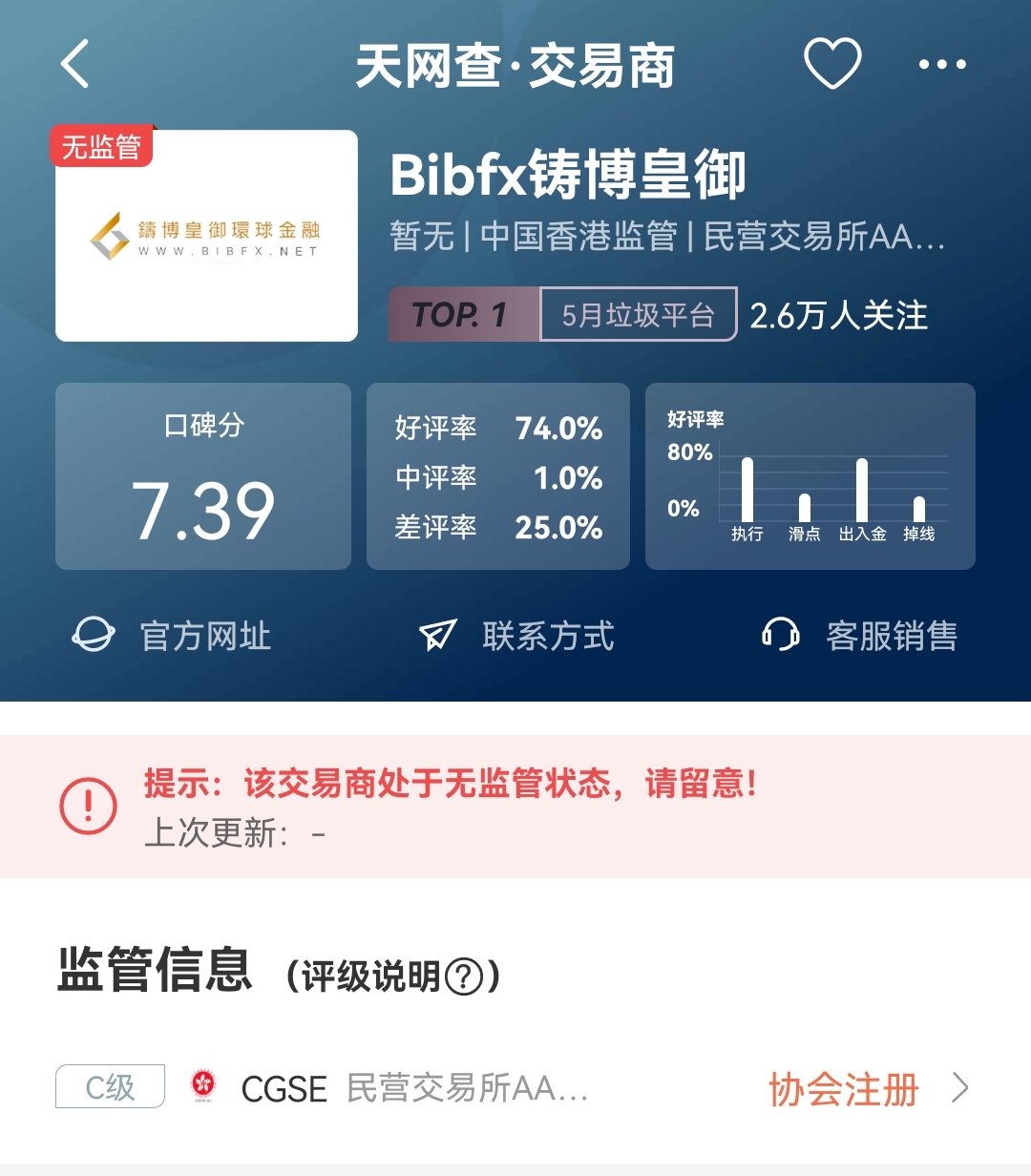 Bibfx铸博皇御目前在天网查的状态为“无监管”。该平台目前未受到任何监管,只是香港金银业贸易场会员,请大家远离。
