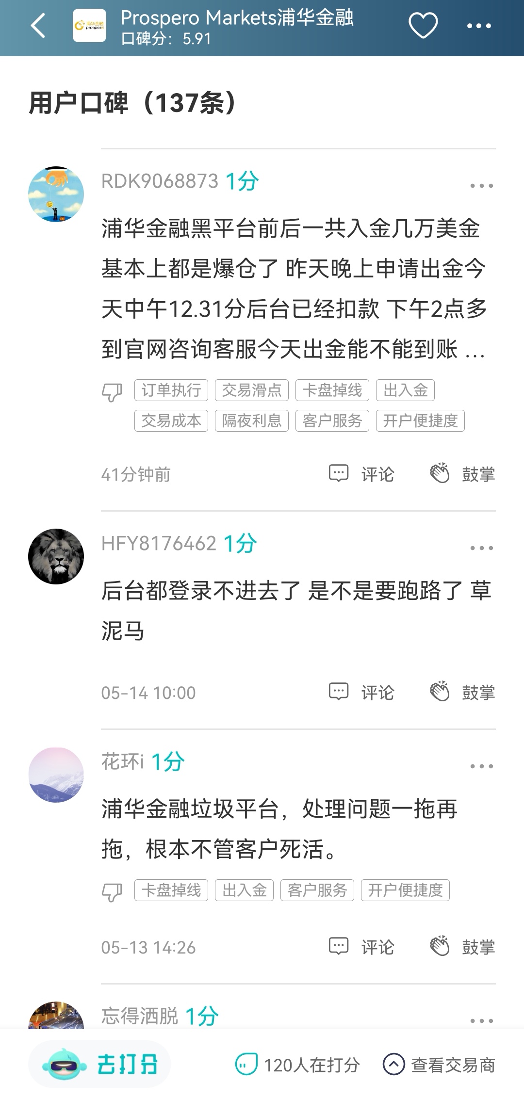 在最新的评论中,可以发现其问题非常多:后台无法登陆、客服不处理问题、卡盘和滑点严重等等,请交易者警惕该平台。