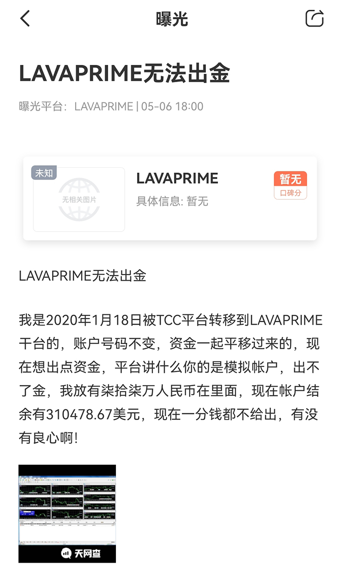虽然这位汇友的遭遇很惨,但天网查查询之后不得不感慨:“他这是从一个坑掉到了另一个坑呀”。不管账户是在TCC,还是转移到LAVA PRIME,都注定是无法出金的。因为这两个平台都是黑平台。