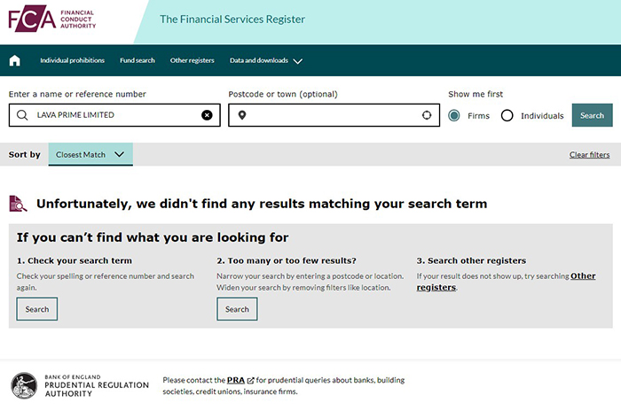 加拿大MSB的M19430623确实对应的公司名称为LAVA PRIME LIMITED,但如上文所说,这个机构不监管金融衍生品。在英国工商网也能查询到LAVA PRIME LIMITED的注册信息,但在英国FCA官网却没有找到相应平台的监管信息。这表明,LAVA PRIME也不受任何监管,是个黑平台。