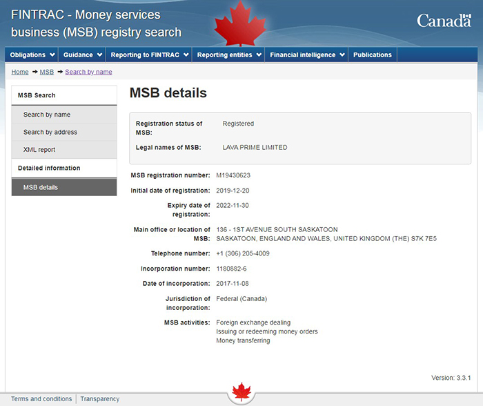 再来看看LAVA PRIME。它也宣称总部在英国,受加拿大MSB监管,监管号为:M19430623。