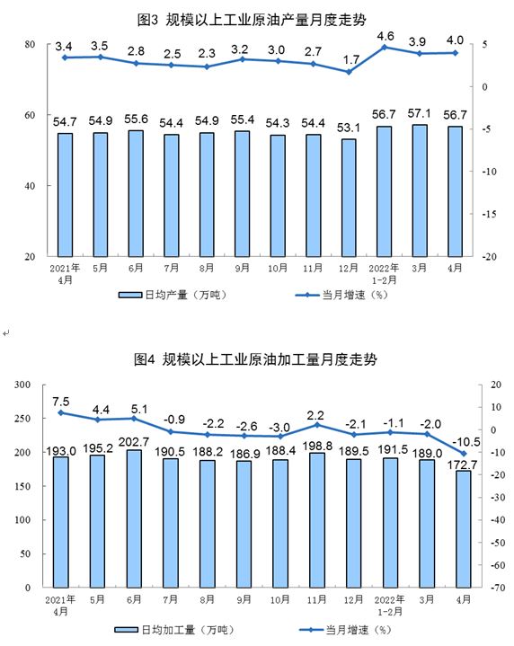 原油生产稳定增长,进口由降转增。4月份,生产原油1700万吨,同比增长4.0%,增速比上月加快0.1个百分点,日均产量56.7万吨。进口原油4303万吨,同比增长6.6%,上月为下降14.0%。