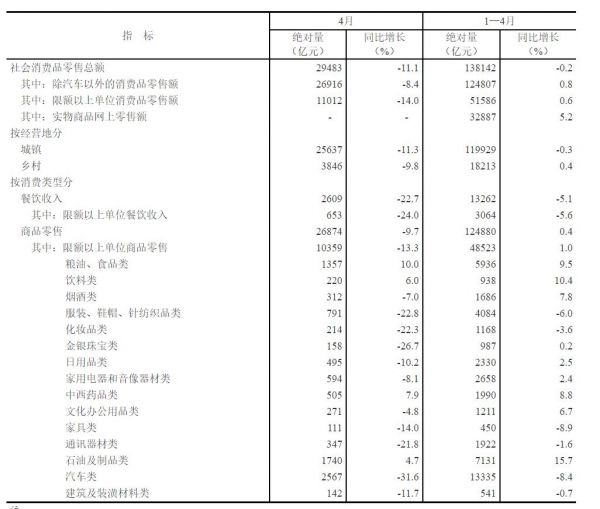 按消费类型分,1—4月份,商品零售124880亿元,同比增长0.4%;餐饮收入13262亿元,下降5.1%。4月份,商品零售26874亿元,同比下降9.7%;餐饮收入2609亿元,下降22.7%。