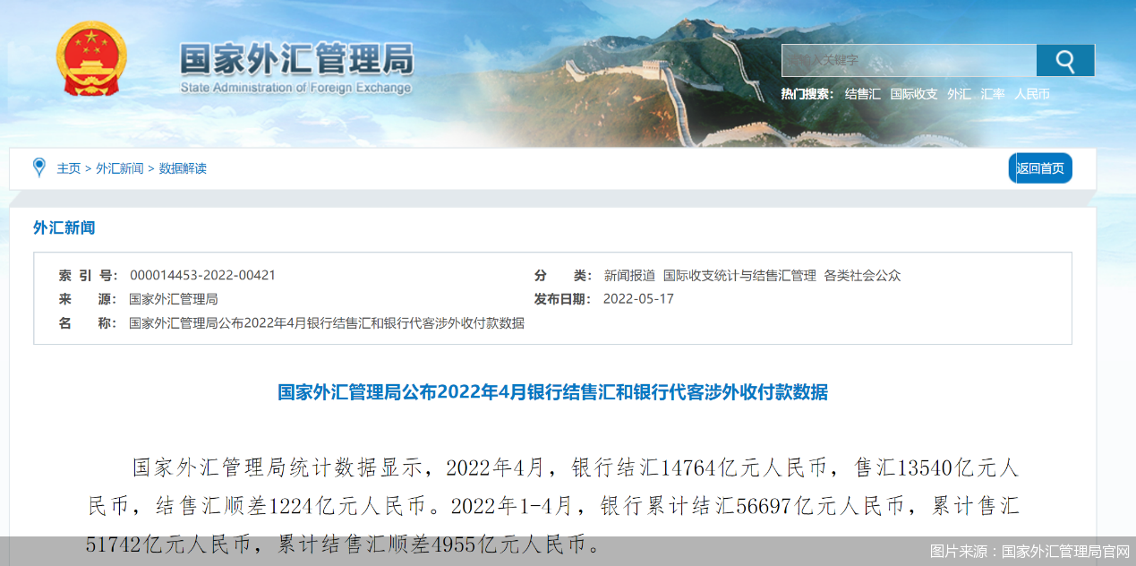 数据显示,2022年4月,银行结汇14764亿元人民币,售汇13540亿元人民币,结售汇顺差1224亿元人民币。2022年1-4月,银行累计结汇56697亿元人民币,累计售汇51742亿元人民币,累计结售汇顺差4955亿元人民币。