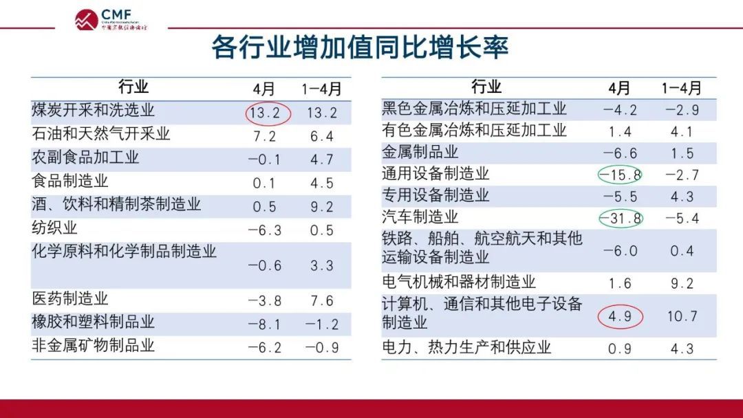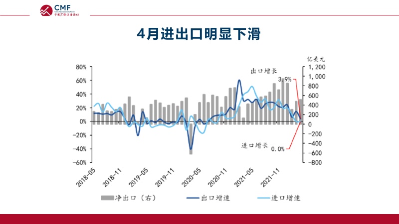 国家统计局发布的数据显示4月份工业增加值由正转负,其中制造业4月份增速为-4.6%,而高技术制造业4%的增速对制造业发展的支撑作用明显;分所有制看,外商和港澳台商投资企业下滑16%,衰退明显;虽然新能源汽车行业保持了高速增长,但是受到上海疫情的影响,汽车行业整体在4月份出现了幅度较大的下滑。除了受制于国内疫情,外需乏力也是整体工业发展动力不足的重要原因。