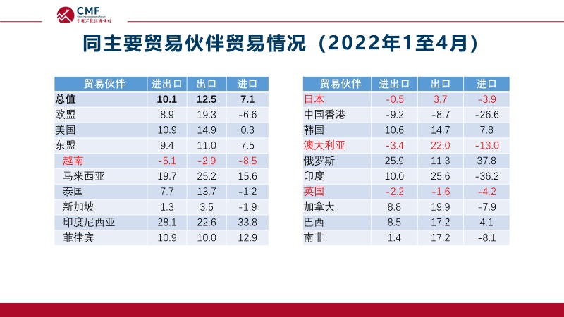 4月份出口下行,除了去年同期基数较高的原因,还受到内外部因素的双重影响。一方面,上海封控措施升级,对出口运输造成较大影响;叠加疫情管控影响出口企业开工,降低供应链稳定性,也在一定程度上影响到我国的出口。另一方面,东盟国家复工复产进程推进,海外订单转移明显,冲击了我国的出口。