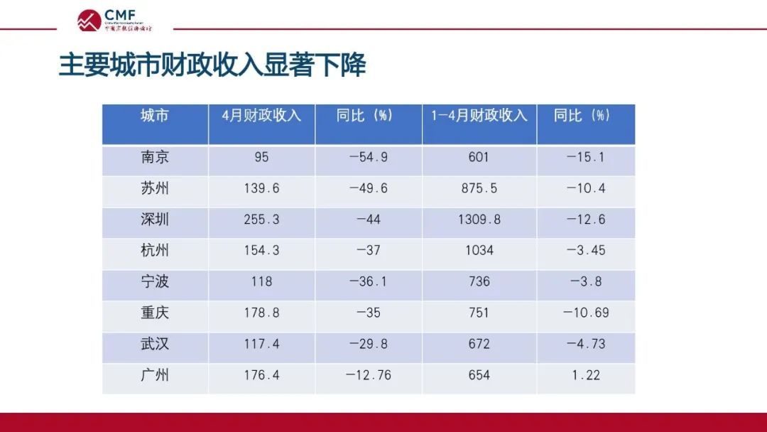 而在财政方面,南京、苏州、深圳、杭州等几大重要城市4月份财政收入下滑较为严重,同比下降40%左右。原因有以下几点:第一,增值税留抵退税。国家推出了增值税留抵退税的政策,进入4月之后,很多企业都开始办理退税手续。第二,减税、缓税政策的实施。多地根据当地实际情况给予减免税收或者暂缓企业缴纳税收。与此同时,各地政府在疫情防控、居民补贴上的支出增加了自身的财政压力。