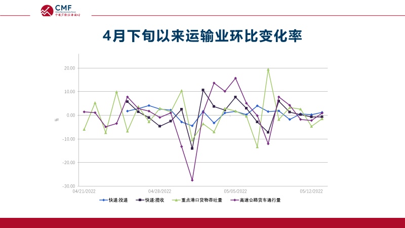 从趋势来看,4月下旬运输业发展状况有所恢复,快递揽收和投递、重点港口货物吞吐等高频数据都在增长;此外5月份以来货运流量指数有所回暖,物流的恢复也将会带来经济活力的恢复。