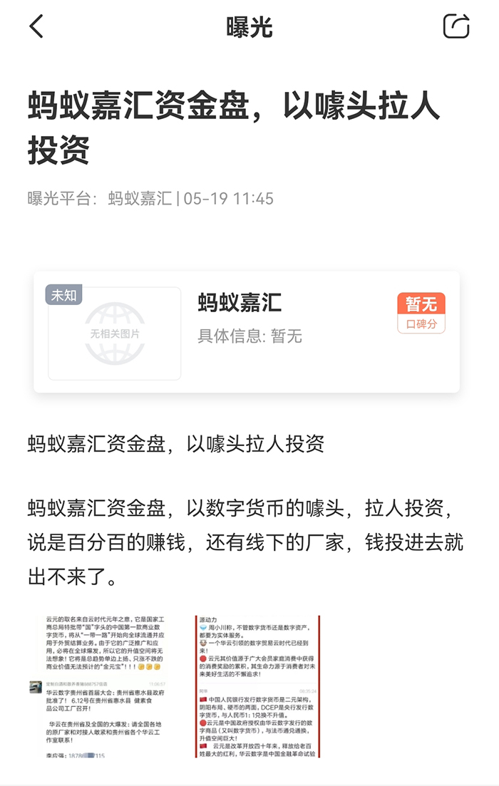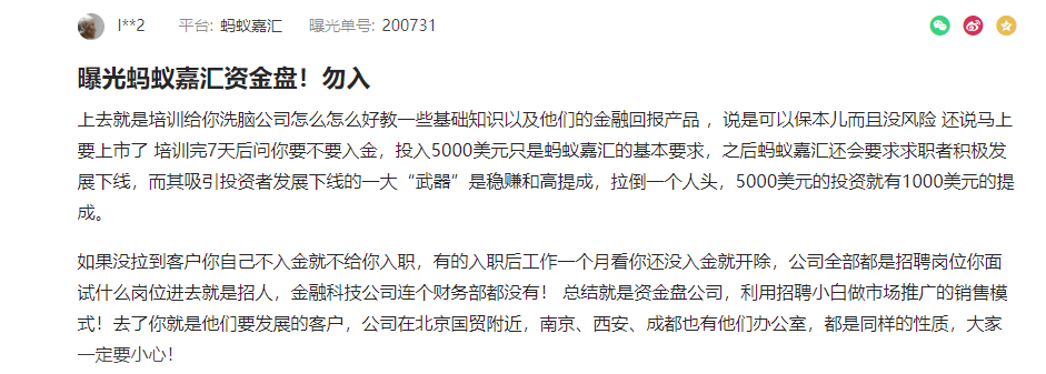 在2020年底,天网查也收到一条蚂蚁嘉汇的投诉,以下资料是投诉者曝光的资料: