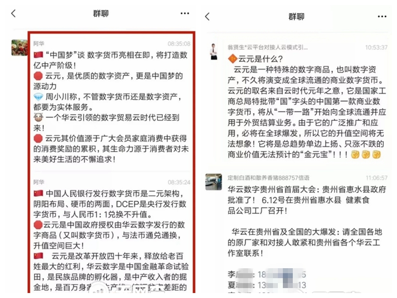 从推广截图中可以推测,蚂蚁嘉汇推出了一款名叫“云元”的数字货币。为了使投资者相信“云元”的权威性,在推广中引用了不少关于数字货币的重要领导人讲话以及机构、大会背书,宣称云元是“国家工商总局特批带国字头的中国第一款商业数字货币”、称它的“升值空间将无法想象,它将是总趋势单边上扬、只涨不跌的商业价值无法预计的金元宝”。