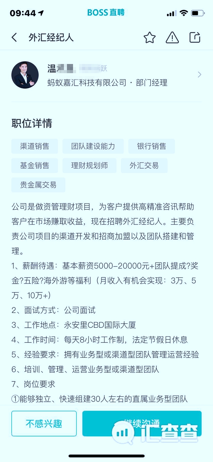 从图中可以看到,蚂蚁嘉汇当时正在招聘经纪人,经纪人的主要职责是“渠道开发和招商加盟以及团队搭建与管理”,岗位要求能快速组建30人左右的业务团队,给出的薪酬待遇非常之高,号称月收入有机会实现3万甚至达到10万。