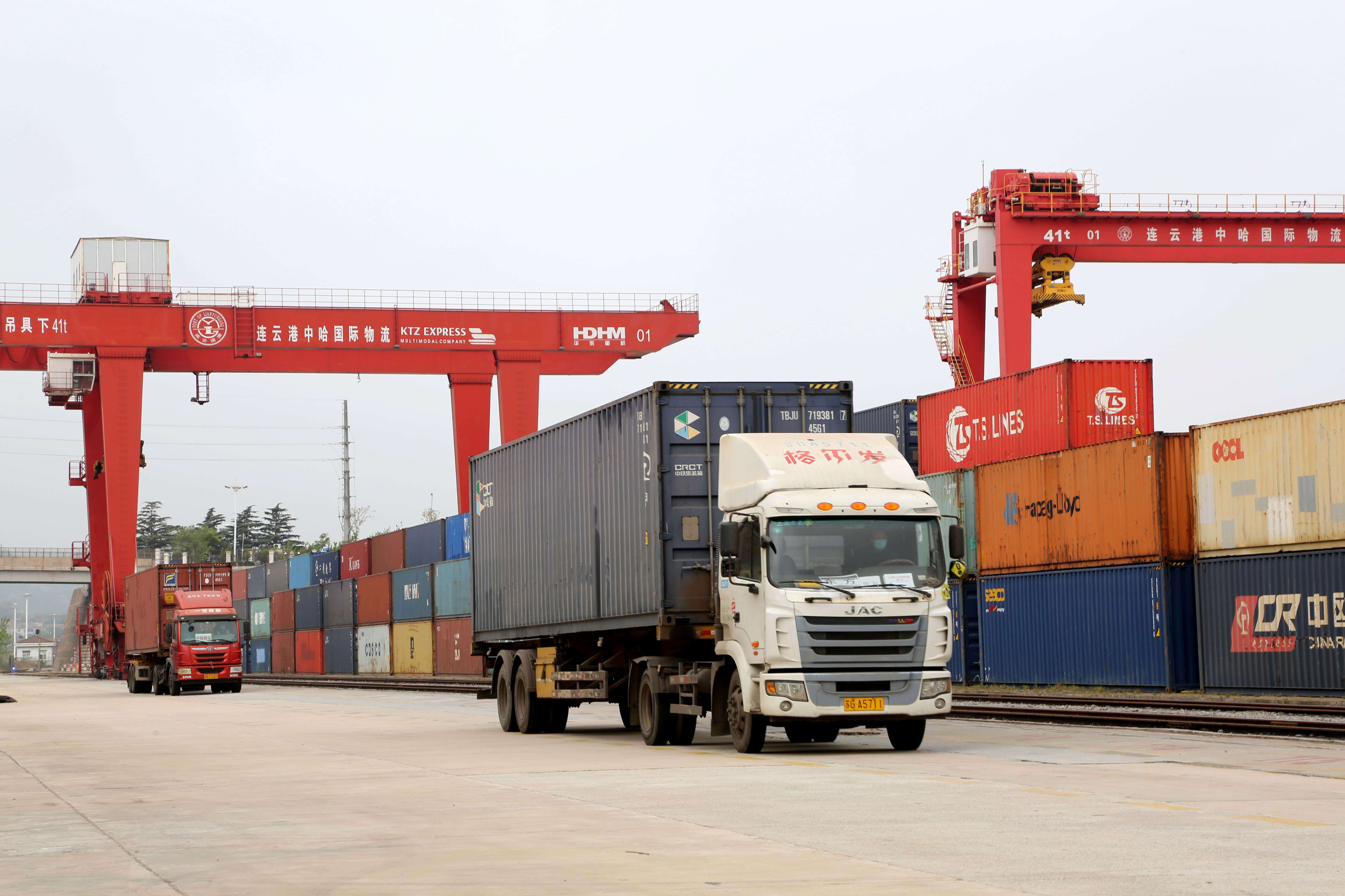 4月25日,江苏连云港(601008),中哈物流园基地内,运输车辆正在转运集装箱。图/IC photo