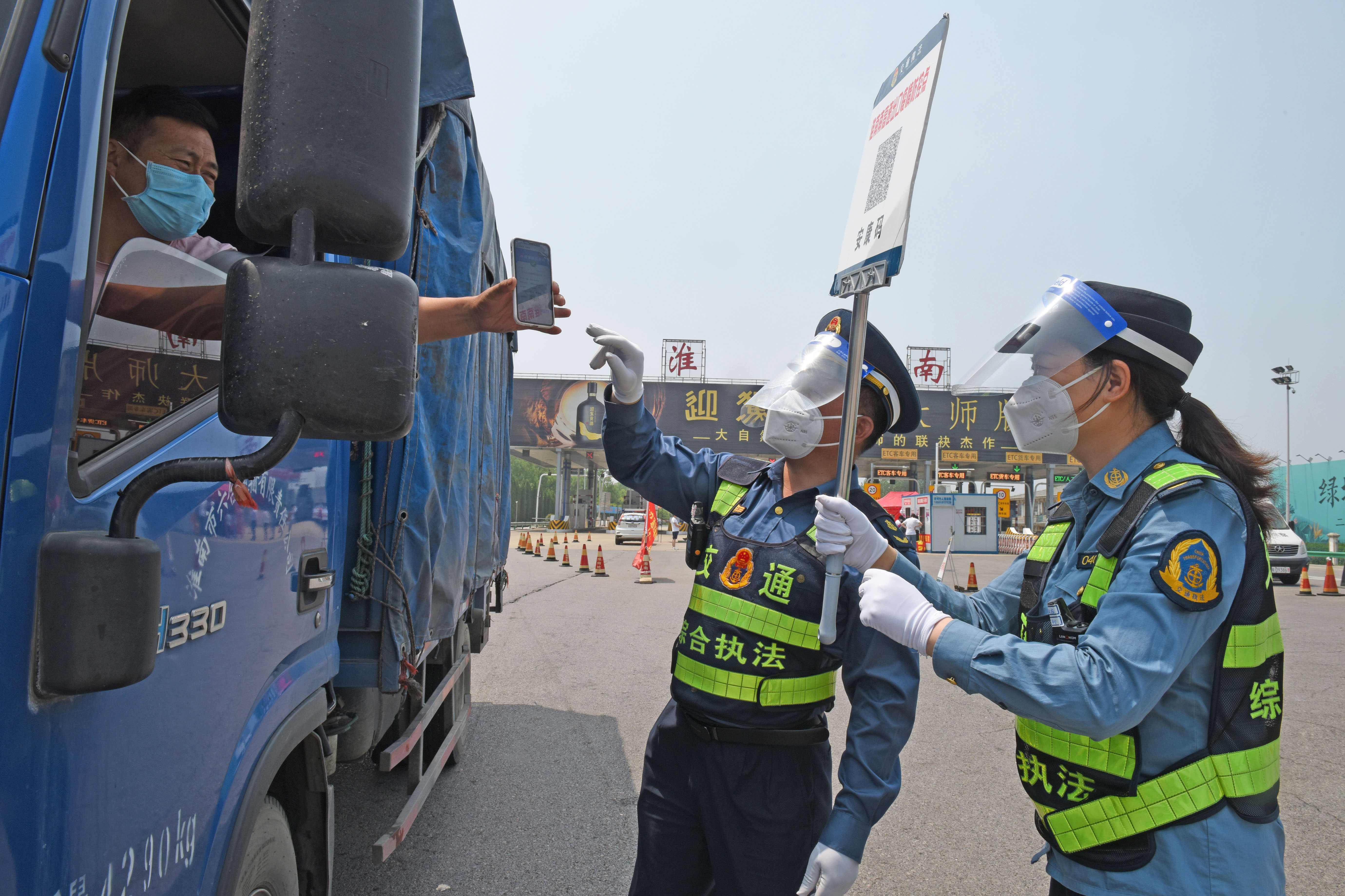 5月7日,安徽省淮南市,执法人员在高速出口处查验货车司机健康码、48小时内核酸阴性证明,引导货车司机优先通行。图/IC photo