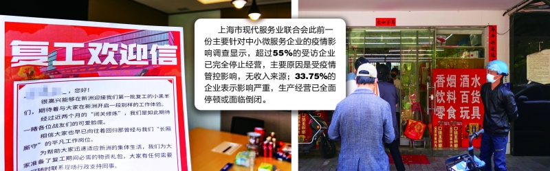 由于中小微企业抗风险能力较弱,在停工约2个月后,不少中小微企业的生产经营已面临较大困难。上海市现代服务业联合会此前一份主要针对中小微服务企业的疫情影响调查显示,超过55%的受访企业已完全停止经营,主要原因是受疫情管控影响,毫无收入来源;33.75%的企业表示影响严重,生产经营已全面停顿或面临倒闭等问题。