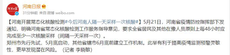 5月21日,河南省要求全省居民及其他在豫人员原则上每48小时应完成至少一次核酸采样。居民可在各地布设的便民核酸采样屋免费采样。