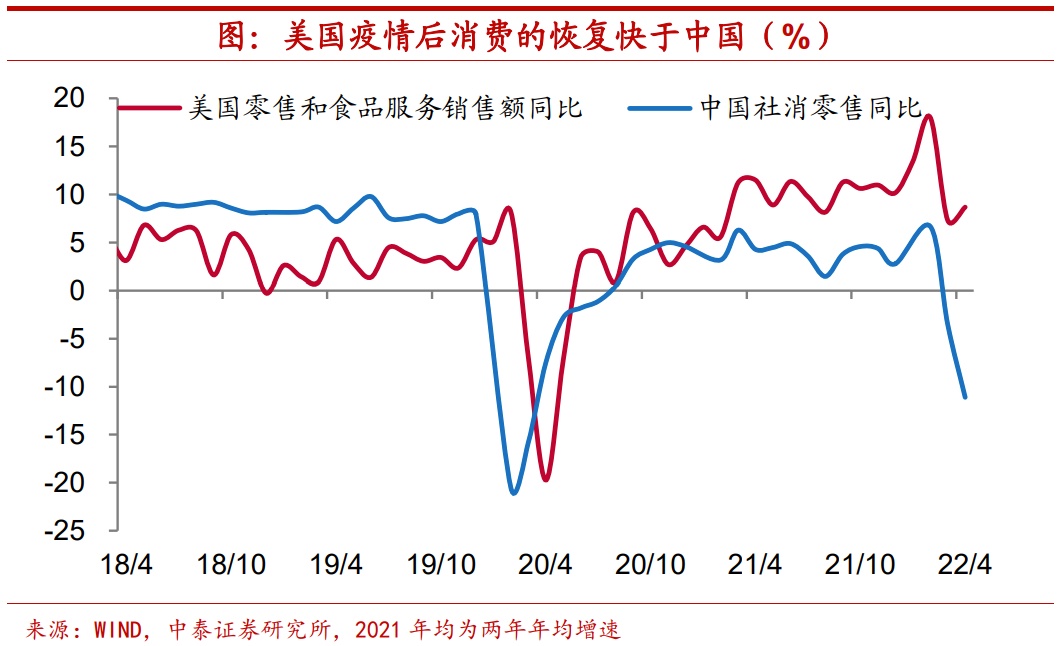 疫后消费恢复,速度不及美国。今年以来我国消费恢复再度受到疫情干扰,4月社消零售总额同比增速跌至-11.1%的低位,和武汉疫情时期增速有所接近。自新冠疫情以来,我国消费的恢复速度相比于美国略显缓慢。我国先于美国遭受新冠疫情的冲击,而美国消费增速在20年6月率先转正,之后美国商品消费增速加快恢复并超过疫情前水平。而我国社消零售增速直到20年8月才升至0.5%,较2019年12月仍低7.5个百分点,与疫情前仍有不小的差距。