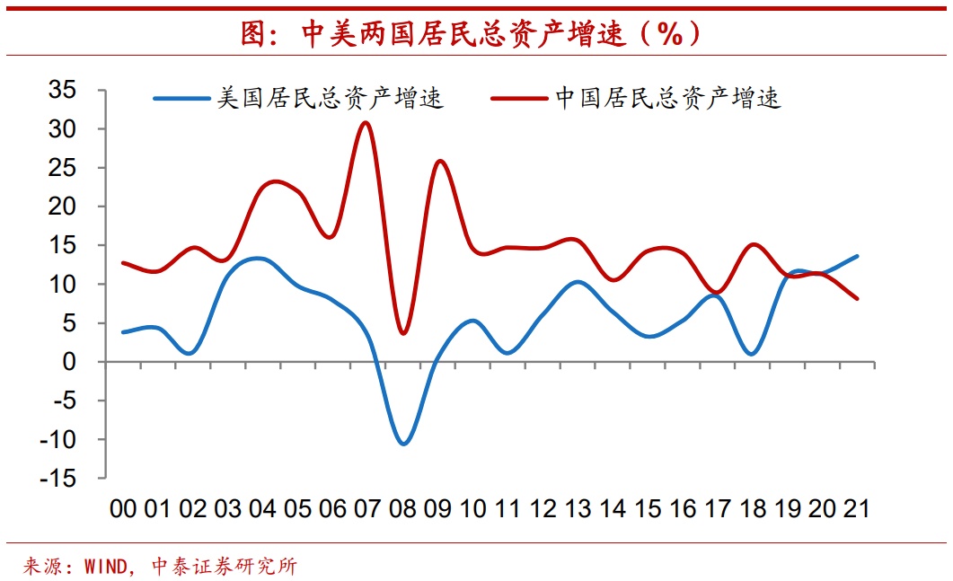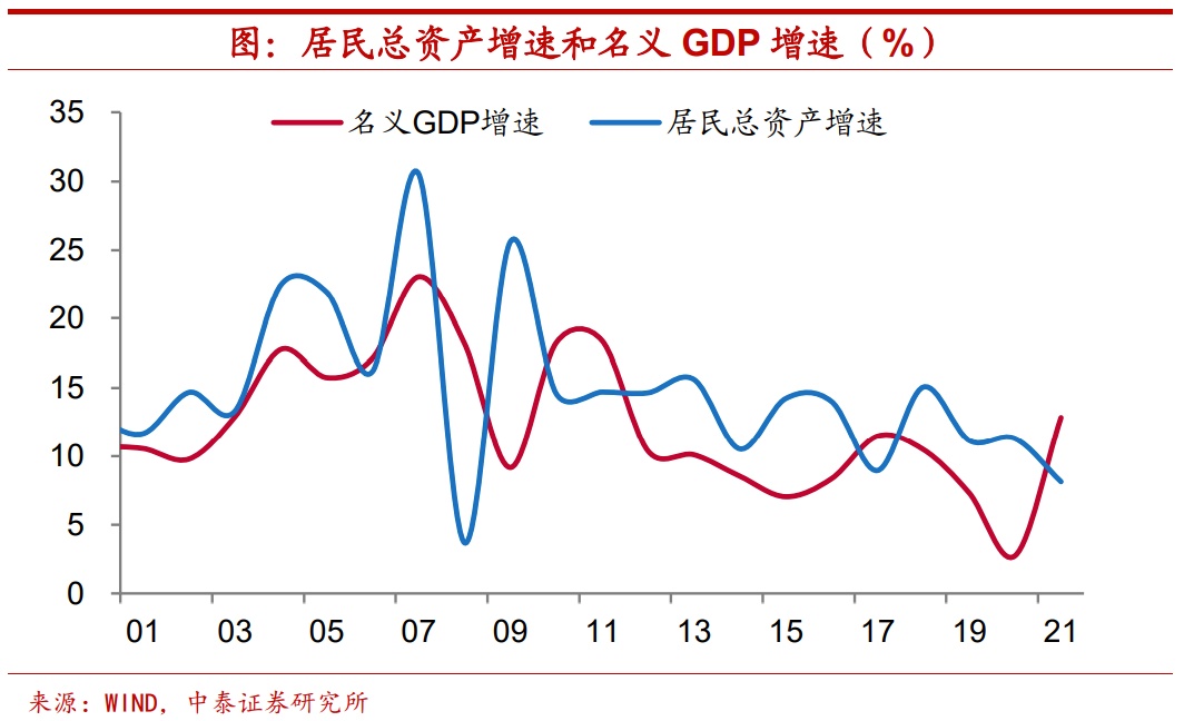 居民资产增速,跟随经济走势。从总量上来看,我国居民资产增速与经济增长速度紧密相关。2000到2007年,我国名义GDP年均增速达到15.2%,同期居民资产均增速也有18.5%左右。而2010年以后,我国经济增速中枢明显降低,2011年至2021年,名义GDP年均增速下滑至8.9%,居民总资产的年均增速同步回落至12.3%,较前期也有明显下降。