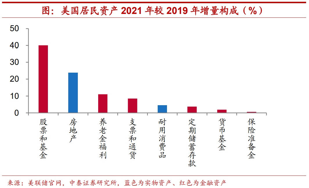 多数资产均有贡献。从美国居民各类资产来看,对于资产价值的增长均有贡献。具体来说,实物资产年复合增速从2018-2019年的5.4%上行至疫情后的12.7%,金融资产增速则从2018-2019年的6.2%同步走高至12.8%,两者在疫情后均呈现加速增长的态势。从疫情后各类资产增量上来看,股票和基金、房地产以及养老金贡献了约75%,这三者也是美国居民部门资产最主要的构成部分,占总资产的比例合计超过70%。