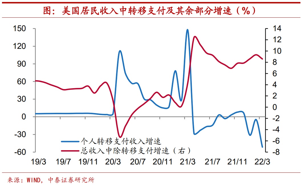 支持模式区别,财政补贴居民。之所以美国居民资产在疫情后增长速度较快,和政府支持下的纾困政策密不可分。为了应对疫情对居民收入和消费带来的冲击,美国进行了多轮财政刺激,其中均包括了对居民的现金转移支付。以2020年4月为例,美国个人转移支付占总收入比例从2019年的平均16%飙升至29%,反映了CAREs法案中现金支出的部分。而我国则采用了不同的政策路径,财政发力更多地在于企业端,如针对中小企业减税降费和发放定向补助等,我国的工业生产也因此先于消费得到修复。不过,在今年外需可能逐渐放缓的态势下,给我国经济增长也带来了一定压力。