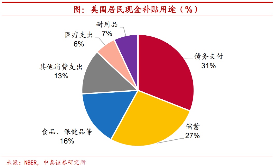 改善居民资产,四成用于消费。在大规模的现金补贴下,美国居民资产负债表在疫情期间保持了比较健康的状态,根据NBER的调查,美国居民将31%的现金补贴用于支付债务、27%用于储蓄,而剩下42%用于消费,现金补贴政策使得美国居民的可支配收入不降反升,储蓄和消费双双增长,使得美国居民资产状况在疫情后并未明显受损,反而存在一定程度的改善。