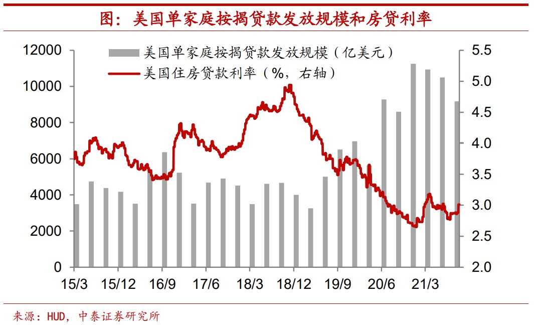 货币“不限量”宽松,房地产市场繁荣。此外,疫情后美联储开启“无限量”宽松,低利率和充足的信贷供给也刺激了居民的购房需求。2020年11月,美国30年期固定利率贷款的利率降至2.72%的低位,同比大幅下行103BP,美国房市录得量价齐升。利率的大幅下行也降低了耐用品的信贷成本,美国耐用品消费成为提振疫后消费的主要力量。同期我国货币政策相对较为克制,在“房住不炒”总基调下,房贷利率下降的幅度有限,不及美国房地产市场的显著繁荣。而资产价格的上涨带动美国居民资产增速随之“水涨船高”。