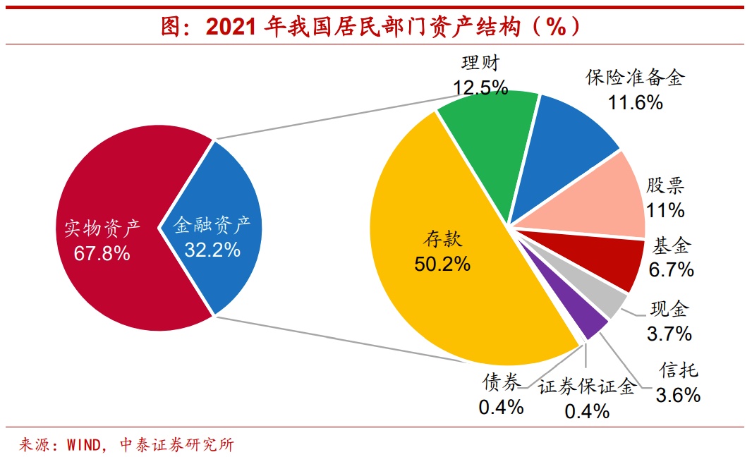 实物资产住房为主,金融资产存款近半。具体来看,我国居民资产可分为实物资产与金融资产两类。其中实物资产以房地产为主,还包括其它如汽车和生产性固定资产等类别。截至2021年末,实物资产规模占我国居民总资产比重约为68%,而房地产占总资产的比例就高达64%。而我国居民持有的金融资产主要包括现金、存款、债券、股票、基金、保险准备金、银行理财和信托等,金融资产规模占我国居民总资产的比例为32%。其中存款占据金融资产的半壁江山,2021年末居民存款规模约占居民金融资产的50%、占居民总资产的16.1%,紧随其后的是银行代客理财、保险准备金和股票,占居民金融资产的比例分别为12.5%、11.6%和11%,占总资产的比例分别为4%、3.7%和3.5%,而证券投资基金、本币通货、信托权益、证券保证金和债券等其他金融资产规模和占比较低。