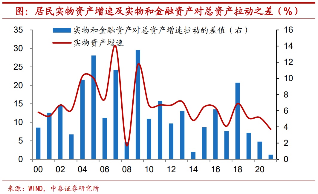 实物资产贡献下滑,金融资产较为稳定。从结构上来看,我们发现,自2010年后,金融资产对于总资产增速的贡献较为稳定,而实物资产对于居民资产增速的贡献开始明显下滑,与金融资产贡献的增速之差也越来越小。2021年,居民部门总资产增速约为8.1%,其中实物资产贡献4.3个百分点,金融资产贡献3.8个百分点,两者差距已经不大;而在2011年时,实物资产贡献的增速约是金融资产的3倍。