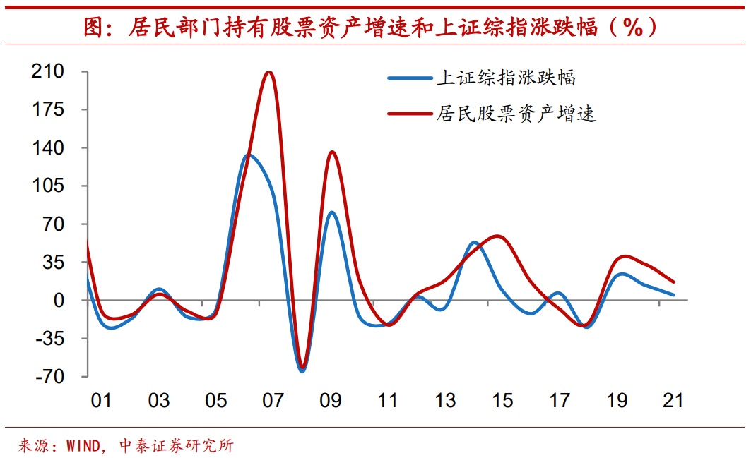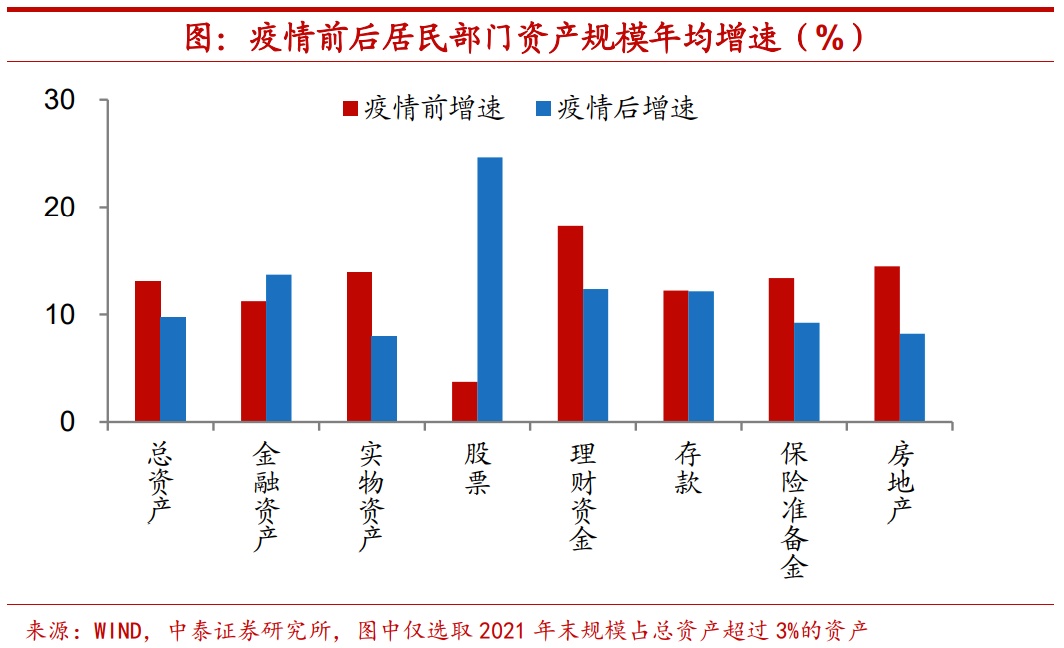 股票资产规模扩张,疫后市场表现尚可。居民金融资产中,股票资产的增长在疫情后整体而言存在明显加速。从过往经验来看,股票、基金和理财等金融资产规模与市场表现息息相关。随着疫情后2020年和2021年股市的两年接连上涨,居民部门持有的股票资产价值较疫情前显著上行。