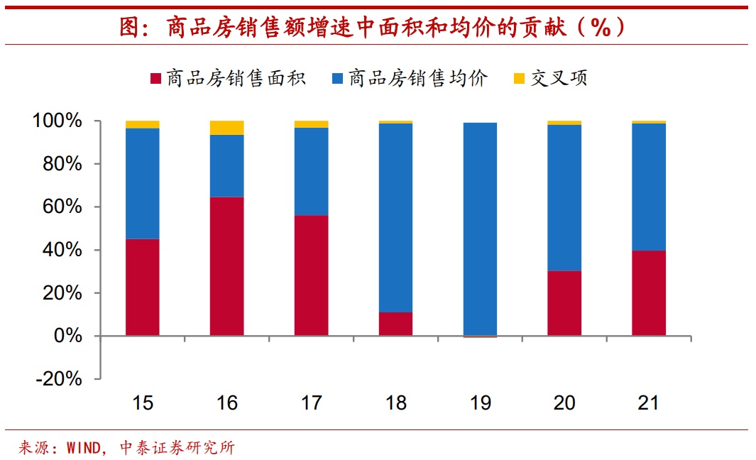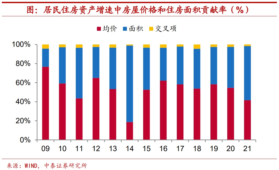房住不炒之下,面积带动增长。近几年在“房住不炒”的政策基调之下,商品房销售均价增速有了明显放缓。2019年以来,尽管商品房价格的增速整体仍高于销售面积的增速,但其对于销售额的贡献逐年递减,而面积的贡献日益增长。据此,我们认为靠房价大幅上行来带动居民资产规模快速扩张的时代或已过去,居民住房资产的拉动可能主要由面积增长提供。