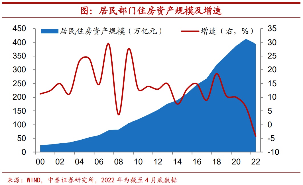 增速渐趋下行,疫后加快回落。事实上,我国居民部门资产增速早在2010年后就已逐渐趋于下行。2008年以前,我国居民总资产增速中枢接近20%,而2011年至2019年,居民总资产年复合增速降至13%左右。如果将居民资产作为居民财富的代理变量,这意味着我国居民财富的积累速度逐步放缓。根据我们的测算,在新冠疫情的冲击下,居民资产的增长受到明显的干扰,资产增速回落至个位数水平。