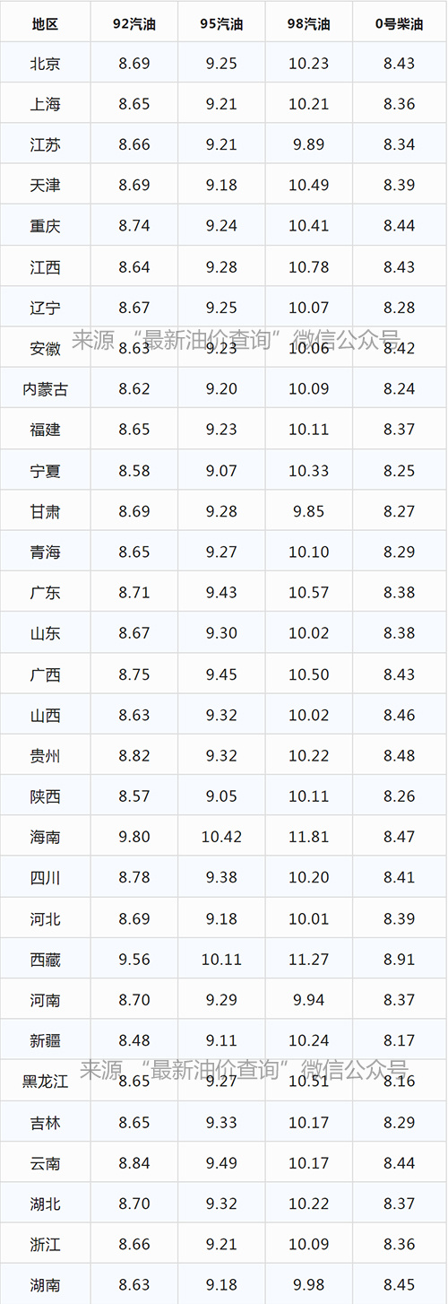 折合每升,89号汽油上调0.29元,92号汽油上调0.31元,95号汽油上调0.33元,0号柴油上调0.33元。以油箱容量50升的普通私家车计算,这次调价后,车主们加满一箱油将多花15.5元左右。