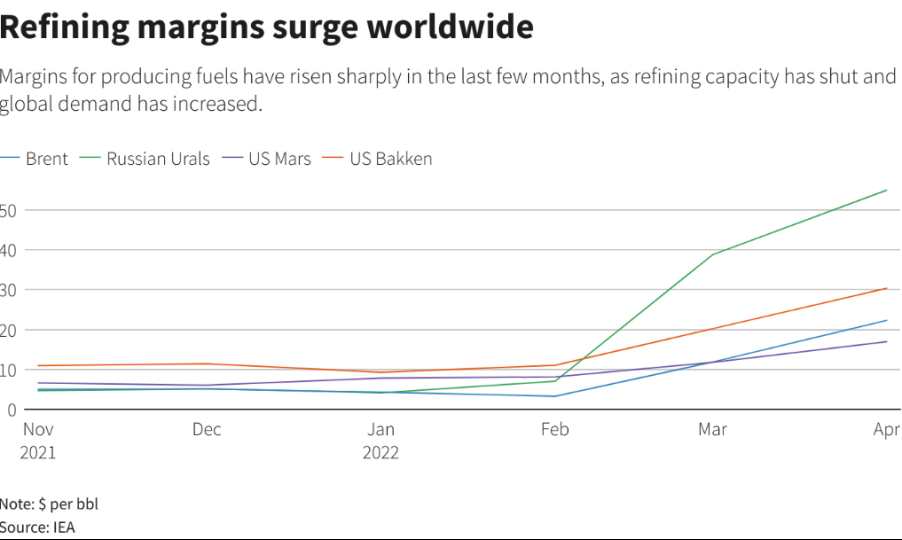 过去几个月,随着炼油产能关闭和全球需求增加,燃料生产的利润率急剧上升。?
