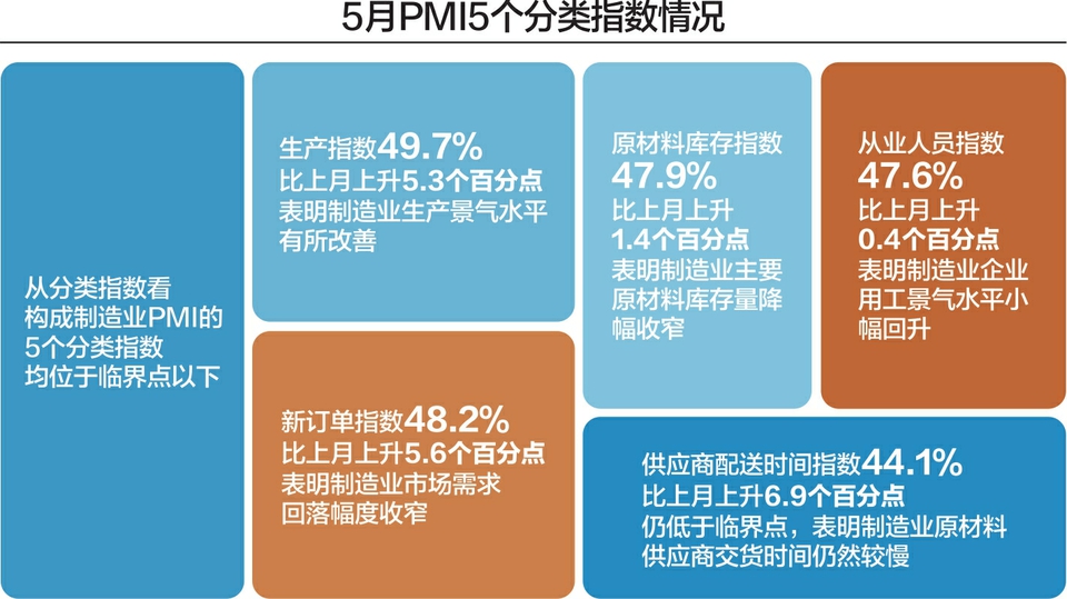 数据显示,5月制造业采购经理指数(PMI)为49.6%,虽低于临界点,但比上月上升2.2个百分点,制造业总体景气水平有所改善。