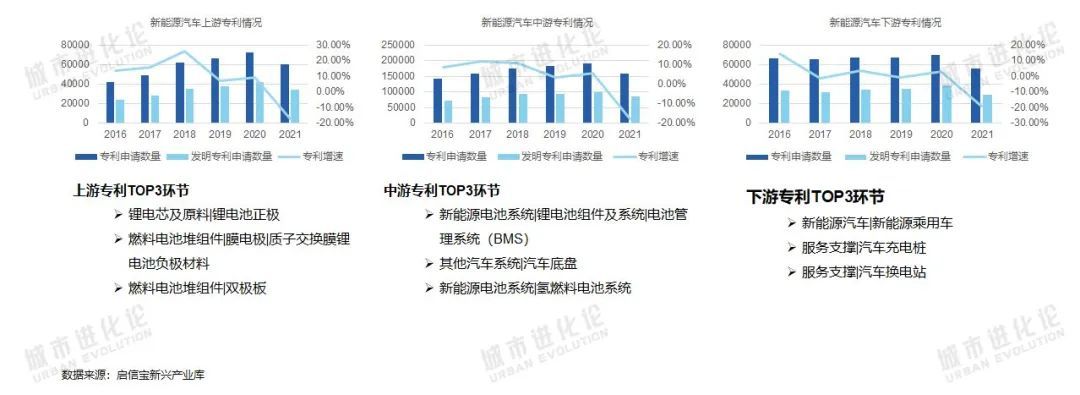 启信宝数据显示,过去六年,新能源汽车产业链中游申请发明专利数量累计达52.61万件,对比上游20.11万件、下游22.94万件来看,具有突出优势。