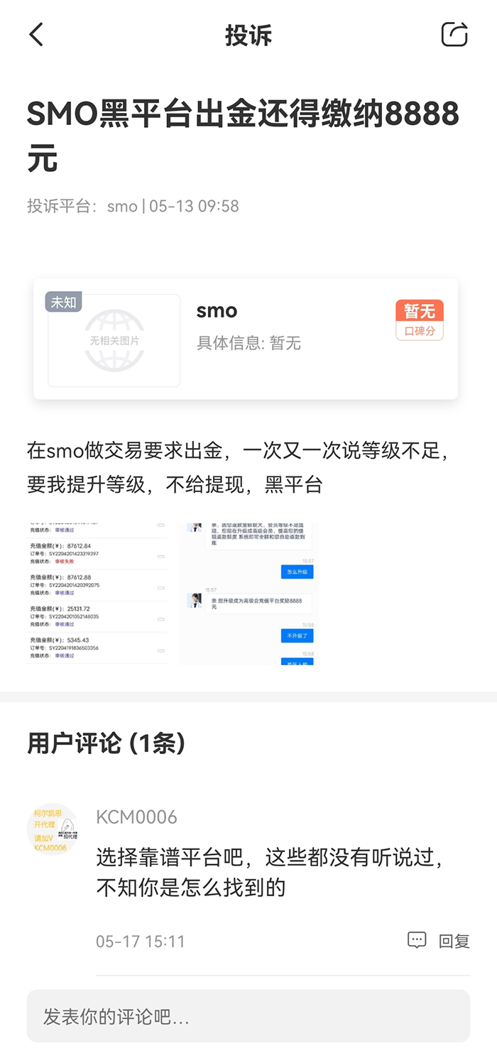 下图是天网查5月中旬收到的一条汇友投诉:在SMO做交易,申请出金被一次又一次以等级不足提现为由拒绝,被平台反复要求充值提升等级。