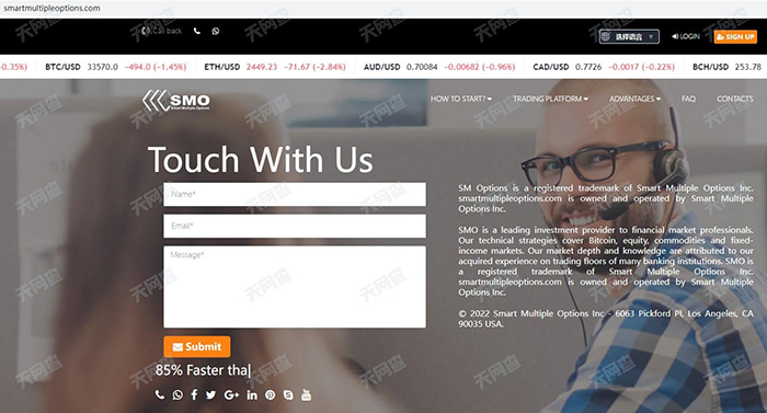 正规平台当然不敢不出金还要客户继续充值。查询SMO的官网(该网站目前还能正常打开,请警惕),其上宣称平台SM Options是Smart Multiple Options Inc.的注册商标,注册地址位于美国,是一家外汇差价合约产品投资提供商,但平台未提供具体的监管信息。