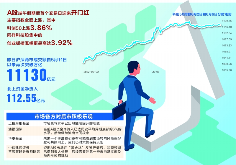 A股端午假期后的第一个交易日迎来开门红,主要指数全面上涨。上证指数上涨1.28%,站上3200点,深证成指上涨2.66%,沪深300指数上涨1.87%,创业板指上涨3.92%,科创50上涨3.86%,全市场3760只股票价格出现上涨。昨日沪深两市成交额达11130亿元,是5月11日以来再次突破万亿,北上资金净流入112.55亿元。